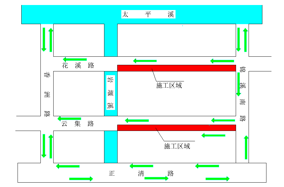 2、花溪路(錦溪南路至巖堰溪)進(jìn)入南側(cè)小區(qū)、道路的車輛錦溪南路繞行至云集路;