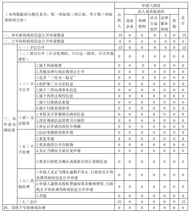 全年收到15信息公開申請,均已按時辦結。在行政復議、訴訟方面,也未收到有關政府信息公開的行政復議申請,也未發(fā)生關于政府信息公開的行政訴訟案件。