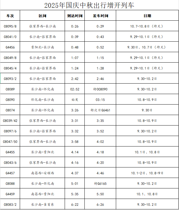 記者從懷化高鐵南站獲悉,為更好地滿(mǎn)足廣大旅客的出行需求,懷化高鐵南站將加開(kāi)多趟列車(chē),服務(wù)旅客探親、旅游出行。具體如下:
