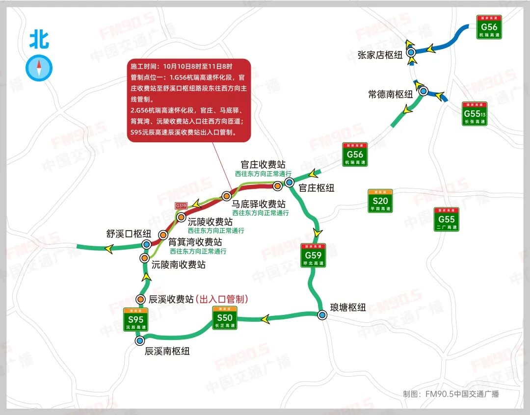 1.G56杭瑞高速懷化段,官莊收費(fèi)站至舒溪口樞紐路段東往西方向主線管制。